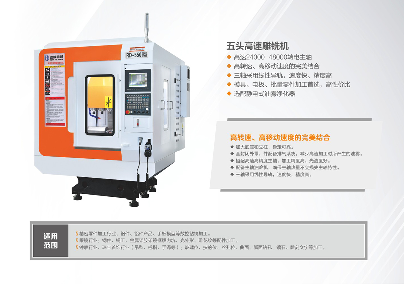 新型環(huán)保數控CNC -高速雕銑機采用高速24000-48000轉電主軸,選配靜電式油霧凈化器,三軸采用線性導軌,速度快,精度高,是模具、電極、批量零件加工;采用臺灣新代或臺灣寶元控制系統(tǒng),日本YASKWA電機及驅動,臺灣上銀、銀泰導軌及滾珠絲桿,華雕精密主軸,是高轉速、高移動速度的結合。
